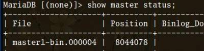 CHANGE MASTER TO MASTER_LOG_FILE='master1-bin.000004', MASTER_LOG_POS=8044078;